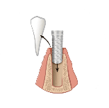 The implant, a small titanium post, is surgically inserted into the jawbone. Over time, it will fuse with the bone via a process known as osseointegration.